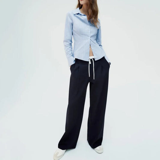 Women’s Wide-Leg Pants – Double Waistband, High Elastic, Drawstring & Side Pockets